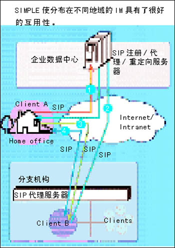許多IM基礎(chǔ)設(shè)施在沒有任何改變的情況下重新使用了SIP。例如,IM客戶機向SIP注冊服務(wù)器發(fā)送一個REGISTER消息,通知服務(wù)器可以接收IM,這就像在一個普通的SIP系統(tǒng)中,注冊服務(wù)器對終端的登錄進行處理一樣。