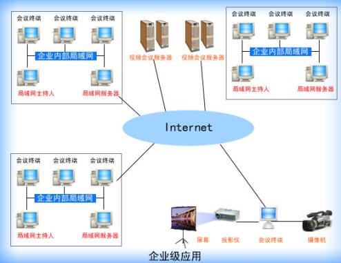 在企業(yè)級別的應用中,企業(yè)將服務器構架在公司內部,遠程用戶及局域網內部的用戶均可登錄服務器,實現(xiàn)交互。企業(yè)級視頻會議系統(tǒng)的應用實際上就是將桌面級視頻會議與會議室級視頻會議系統(tǒng)有機的結合在一起,客戶端硬件外設可以按照以上的建議,根據各終端不同的需求進行配置。