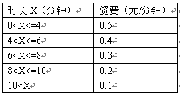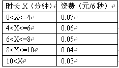 例3,國內(nèi)長途話費在時長不超過4分鐘的情況下,按0.07元/6秒收;超過4分鐘但不超過6分鐘,統(tǒng)一按0.06元/6秒收;超過6分鐘但不超過8分鐘,統(tǒng)一按0.05元/6秒收;超過8分鐘但不超過10分鐘,統(tǒng)一按0.04元/6秒收;超過10分鐘,統(tǒng)一按0.03元/6秒收取。