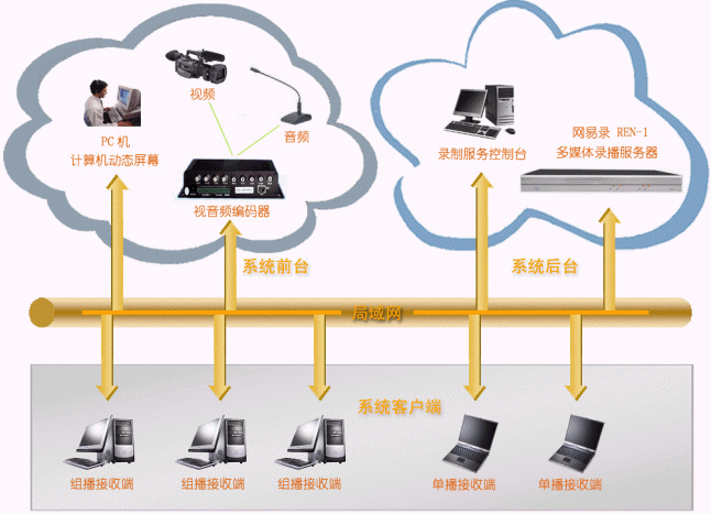 - 系統(tǒng)后臺:連接在網(wǎng)絡(luò)上即可,接受REN-1服務(wù)器管理端發(fā)送來的系統(tǒng)管理、維護指令,并負責(zé)將系統(tǒng)前臺發(fā)送來的視頻、音頻、計算機動態(tài)屏幕進行實時錄制和直播,它包括:網(wǎng)易錄媒體中心(REN-1),它為系統(tǒng)的核心,主要完成視頻、音頻、計算機動態(tài)屏幕的錄制和直播;
