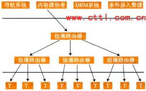 IPTV業(yè)務(wù)提供者可以根據(jù)用戶的請求,利用IP網(wǎng)絡(luò)本身所提供的組播能力將視頻信息以組播的方式傳送給用戶。此時,同時向相同的業(yè)務(wù)提供者請求發(fā)送相同內(nèi)容信息的用戶,可以由業(yè)務(wù)提供者安排在同一個組播組中接收到相同的信息。為給內(nèi)容提供者提供知識產(chǎn)權(quán)保護(hù),業(yè)務(wù)提供者提供條件接入控制。同時為減少骨干網(wǎng)絡(luò)傳輸?shù)膲毫Γ瑯I(yè)務(wù)提供者在向眾多的用戶提供組播式業(yè)務(wù)時可以利用多級組播的形式來實(shí)現(xiàn)。組播式IPTV業(yè)務(wù)可能的系統(tǒng)模型示意如圖1所示。