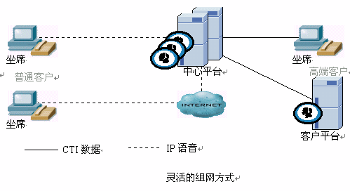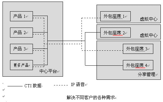 外包中心應(yīng)既能服務(wù)本地業(yè)務(wù),同時(shí)服務(wù)本區(qū)甚至全球業(yè)務(wù),單點(diǎn)互連接主要為降低服務(wù)成本,共享服務(wù)資源。單點(diǎn)中心應(yīng)具備靈活的組網(wǎng)方式,可管理客戶現(xiàn)有平臺,并具備高質(zhì)量座席向客戶提供高質(zhì)量的高端服務(wù),同時(shí)又有解決普通客戶服務(wù)的一般座席,向客戶提供低價(jià)位的公眾服務(wù),如下圖示意: