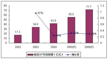 繼2004年中國政府和運(yùn)營商監(jiān)管力度的加大,2005年的短信SP市場(chǎng)規(guī)模增長率為32%,SP市場(chǎng)規(guī)模55.5億元,比2004年略有上升。基于目前短信市場(chǎng)增量市場(chǎng)的縮小,其增長主要依靠對(duì)存量市場(chǎng)需求的深度挖掘。諾盛預(yù)計(jì)2006年的短信市場(chǎng)繼續(xù)保持平穩(wěn)的增長勢(shì)頭,增長率將達(dá)29%。