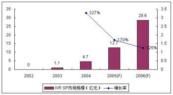 由于運(yùn)營商的監(jiān)管和增量市場(chǎng)需求的減少,2005年IVR高速增長的勢(shì)頭有所回落,市場(chǎng)增長速度趨于理性,SP市場(chǎng)份額增長率為170%,整體SP市場(chǎng)份額達(dá)到12.7億元。諾盛預(yù)計(jì)2006年IVR市場(chǎng)增長率將繼續(xù)回調(diào),但絕對(duì)增長率仍然較快,達(dá)到125%。
