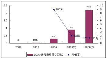 作為SP和移動(dòng)運(yùn)營商都非?春玫臉I(yè)務(wù),JAVA業(yè)務(wù)受到眾多SP的青睞。盡管作為JAVA主要業(yè)務(wù)的手機(jī)游戲目前盈利狀況普遍欠佳,但空中網(wǎng)、美通無線、數(shù)字魚等SP仍然大量投入,期待著未來業(yè)務(wù)的高速增長。受制于終端和JAVA游戲的表現(xiàn)力,2005年JAVA業(yè)務(wù)的SP市場(chǎng)規(guī)模增長率回落到200%,諾盛預(yù)計(jì)2006年JAVA的使用環(huán)境沒有太大變化,其增長率進(jìn)一步回落至144%。