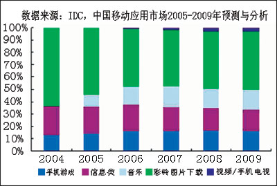 與此同時(shí),中國移動(dòng)增值電信業(yè)務(wù)占移動(dòng)運(yùn)營商的業(yè)務(wù)收入比重不斷增加,根據(jù)IDC統(tǒng)計(jì),2004年中國移動(dòng)增值服務(wù)市場的個(gè)人應(yīng)用市場達(dá)到340億元人民幣,該市場在2009年將達(dá)到880億元人民幣,其2004年~2009年復(fù)合年平均增長率為15.3%。