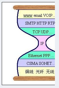RFC1958和RFC3724等所描述的“端到端的透明性”是Internet一直堅持的為數(shù)不多的Internet體系架構(gòu)的核心設(shè)計理念。所謂端到端的透明性,就是在TCP/IP的設(shè)計中,將Internet系統(tǒng)中與通信相關(guān)的部分(IP網(wǎng)絡(luò))與高層應(yīng)用(端點)分離,最大限度地簡化網(wǎng)絡(luò)的設(shè)計。在有些文獻(xiàn)中也稱其為“沙漏”模型,如圖1。