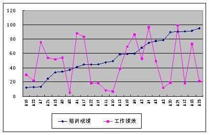 我們通過分析,圖3顯示,員工的培訓(xùn)成績和其工作績效是無關(guān)的,這說明培訓(xùn)是無效的。無效的原因也許是由于培訓(xùn)內(nèi)容不合理或培訓(xùn)組織實(shí)施不善等原因,總之培訓(xùn)是無效的,需要改進(jìn)。