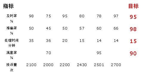 從滿意度的角度來看:5月份的指標(biāo)值已達(dá)到目標(biāo)值95%的要求,但只統(tǒng)計(jì)了2月份和5月份兩個(gè)月的數(shù)據(jù),數(shù)據(jù)收集不完整,因此,我們對(duì)該指標(biāo)無法評(píng)價(jià)(一般認(rèn)為對(duì)三個(gè)以下的數(shù)據(jù)無法做出評(píng)價(jià))。