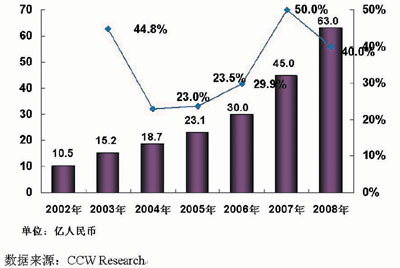 圖 2002—2008年中國視頻會(huì)議系統(tǒng)市場(chǎng)規(guī)模