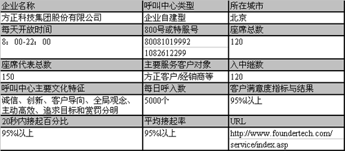 方正呼叫中心是方正服務(wù)平臺的重要組成部分,1999年建立,秉承了北大方正“勤備、嚴(yán)謹(jǐn)、求實、創(chuàng)新”的精神,依托方正科技“誠信、創(chuàng)新、客戶導(dǎo)向、全局觀念、主動高效、追求目標(biāo)和賞罰分明”的核心價值觀,以及“全程服務(wù)”的品牌文化,以“優(yōu)化服務(wù)流程,提高服務(wù)質(zhì)量,培育優(yōu)秀品牌,形成競爭優(yōu)勢,創(chuàng)新服務(wù)模式,加速業(yè)務(wù)增長”作為自己的發(fā)展目標(biāo)和方向,并學(xué)習(xí)業(yè)界先進(jìn)的理念和方法,不斷探索和發(fā)展,多次受到媒體和機(jī)構(gòu)的關(guān)注。