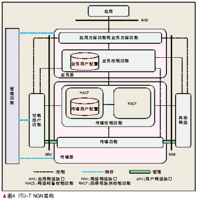 ITU-T下一代網(wǎng)絡(luò)的主要架構(gòu)如圖4所示,NACF是NGN傳輸層的功能實(shí)體,正對應(yīng)于TISPAN NGN架構(gòu)中的NASS。