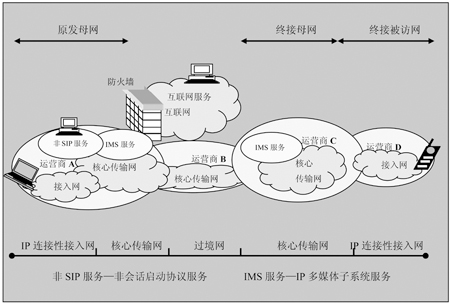 如圖3所示,與一個被訪問的網(wǎng)不同,IP多媒體子系統(tǒng)還支持母網(wǎng)的概念。在這個例子中,母網(wǎng)是支持具有登錄權的IP多媒體子系統(tǒng)的核心網(wǎng)。被訪問的網(wǎng)是當前向用戶提供IP多媒體子系統(tǒng)服務連接的網(wǎng)。圖3中的運營商A擁有許多疊接網(wǎng)用戶的母網(wǎng),而運營商C擁有移動電話的母網(wǎng),而用戶正在運營商D的網(wǎng)絡中漫游。