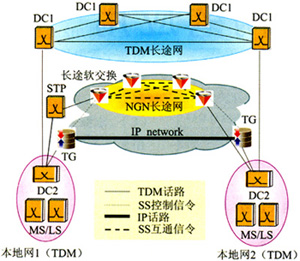 NGN網(wǎng)絡(luò)作為現(xiàn)有TDM長途網(wǎng)的補(bǔ)充,實(shí)現(xiàn)話務(wù)的分擔(dān)和保護(hù)。NGN大容量、廣覆蓋的優(yōu)勢,可以快速分流長途話務(wù)。NGN網(wǎng)與TDM網(wǎng)的關(guān)系如圖2所示。