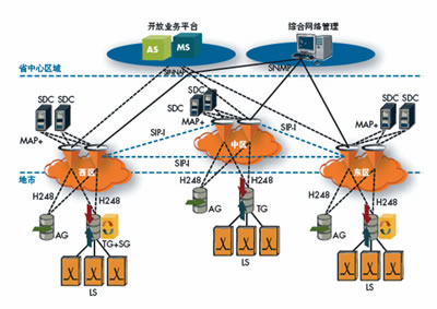 呼叫控制和信令層:三對軟交換被放置于省內(nèi)的三個區(qū)域,為網(wǎng)絡(luò)上的700多萬用戶提供呼叫控制和信令交換。這三個分離的區(qū)域提供省內(nèi)范圍的話務(wù)以及容災(zāi)備份。雙歸屬機制被引入從而能夠在集中式的網(wǎng)絡(luò)拓撲中保障安全和高可靠性。