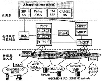 一般IMS分為三層,應(yīng)用層支持各類(lèi)應(yīng)用服務(wù)器,負(fù)責(zé)為用戶提供增值業(yè)務(wù)和第三方業(yè)務(wù)。會(huì)話及呼叫控制層負(fù)責(zé)管理呼叫或會(huì)話設(shè)置,其中呼叫會(huì)話控制模塊CSCF完成呼叫網(wǎng)關(guān)功能、呼叫業(yè)務(wù)觸發(fā)功能和路由選擇功能,將SIP信令消息正確地轉(zhuǎn)發(fā)到應(yīng)用服務(wù)器。歸屬用戶服務(wù)器HSS用于維護(hù)每個(gè)終端用戶獨(dú)有的業(yè)務(wù)屬性,包括IP地址、漫游信息、好友列表、呼叫業(yè)務(wù)定制信息及語(yǔ)音郵件設(shè)置等。HSS是全網(wǎng)可用資源。媒體資源功能MRF包括MRFP和MRFC,負(fù)責(zé)提供及控制媒體流資源,如播放通知音、媒體流的混合、編解碼等。媒體網(wǎng)關(guān)控制MGCF負(fù)責(zé)PSTN承載與IP流之間的連接,根據(jù)被叫號(hào)碼和來(lái)話情況選擇CSCF,并完成PSTN與IMS之間的呼叫控制協(xié)議轉(zhuǎn)換,如將從CSCF接收到的SIP消息轉(zhuǎn)換為MEGACO或ISUP消息,并通過(guò)IP發(fā)送到信令網(wǎng)關(guān)SGW。出口網(wǎng)關(guān)控制功能BGCF主要實(shí)現(xiàn)呼叫路由功能,為呼叫選擇適當(dāng)?shù)腜STN接口點(diǎn),若發(fā)現(xiàn)該接口點(diǎn)與自己在同一網(wǎng)絡(luò),則選擇本網(wǎng)絡(luò)的MGCF與PSTN交互,若發(fā)現(xiàn)接口點(diǎn)在另一網(wǎng)絡(luò)時(shí),BGCF將會(huì)話信令轉(zhuǎn)發(fā)給另一網(wǎng)絡(luò)相應(yīng)的BGCF。一個(gè)IMS可以包含一個(gè)或多個(gè)CSCF、HSS、MGCF等功能模塊。傳送及接入層承載各種類(lèi)型之間的轉(zhuǎn)換,完成與傳統(tǒng)PSTN/PLMN間的互通等功能,包括各類(lèi)有線接入、無(wú)線接入、互聯(lián)互通網(wǎng)關(guān)等設(shè)備。