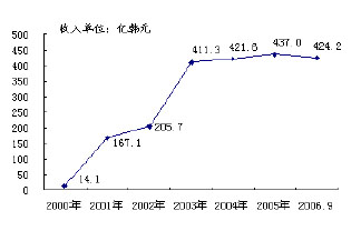 經(jīng)過(guò)6年多的運(yùn)營(yíng),韓國(guó)電信的eBilling業(yè)務(wù)發(fā)展良好,目前與其合作的ICP已達(dá)到500多家,內(nèi)容涵蓋了收費(fèi)郵箱、在線軟件銷售、聊天、娛樂(lè)、游戲、漫畫、綜合信息等;業(yè)務(wù)收入也逐年上升,從2000年的14.1億韓元(折合人民幣0.11億元)增長(zhǎng)到2006年9月份的424.2億韓元(折合人民幣3.3億元),如圖2、圖3所示。