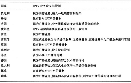 歐盟在1997年發(fā)表的融合綠皮書《邁向信息社會(huì)之路》中明確指出不同的網(wǎng)絡(luò)平臺(tái)都能一同傳送電話信息、電視信息、電腦信息和數(shù)據(jù),并于2003年開始實(shí)施《電子通信網(wǎng)絡(luò)與服務(wù)的統(tǒng)一監(jiān)管框架》,1997年融合指令和2003年統(tǒng)一監(jiān)管框架推動(dòng)了歐盟各國業(yè)務(wù)融合的發(fā)展,歐盟大多數(shù)國家均開放了有線電視和電信市場,允許彼此進(jìn)入。在實(shí)現(xiàn)管制融合的國家,對(duì)電信運(yùn)營商提供IPTV基本沒有準(zhǔn)入方面的限制。但是由于各國對(duì)IPTV定義和認(rèn)識(shí)的不同。IPTV所屬的業(yè)務(wù)類別也有所差異,從而帶來了管制上的差別。