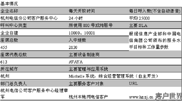 浙江省電信有限公司杭州市分公司客戶服務(wù)中心(以下簡稱杭州電信客服中心,或者杭州電信10000號(hào))成立于2002年9月,是一個(gè)基于CTI技術(shù)、充分利用通信網(wǎng)和計(jì)算機(jī)網(wǎng)絡(luò)的綜合信息服務(wù)系統(tǒng),以電話為主,輔之以傳真、短信、Email、互聯(lián)網(wǎng)等多種接觸媒體,通過人工、自助語音與網(wǎng)上服務(wù)的方式,為杭州400萬電信客戶提供綜合電信業(yè)務(wù)的咨詢、查詢、受理、投訴、報(bào)障和電話營銷。建有2130路中繼通道,1410路自動(dòng)語音通道,186個(gè)人工服務(wù)座席、189個(gè)電話營銷座席、80個(gè)外包座席,占地5600多平米,分別位于杭州市惠興路9號(hào)和慶春路133號(hào)。