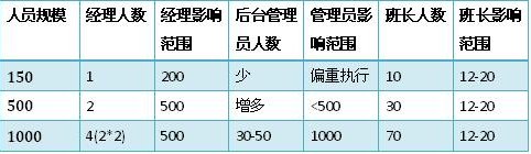 當(dāng)員工人數(shù)到達(dá)500人的時候,班長往往有30位左右。很多經(jīng)理已經(jīng)不能夠?qū)γ课话嚅L有足夠的了解,更不要說去認(rèn)識大部分員工。這個時候,經(jīng)理對班長的比例過寬,需要強(qiáng)化后臺管理員的角色。比如排班、績效、質(zhì)量管理(而不僅是評估)、信息分析(數(shù)據(jù)和報(bào)告)、行政、培訓(xùn)等工作中,這些管理輔助角色都在逐漸強(qiáng)化。而每一個后臺管理者可能成了經(jīng)理的直接下屬,他們起草的流程和制度,來由經(jīng)理決策。某種程度上說,他們比班長的影響力更大,因?yàn)榘嚅L還是影響著12-20人。有時候后臺管理員也決定了班長的時間精力分配,那是班長最寶貴的資源。那么誰是管理者呢?首先是經(jīng)理,其次是后臺管理員,最后才是班長。