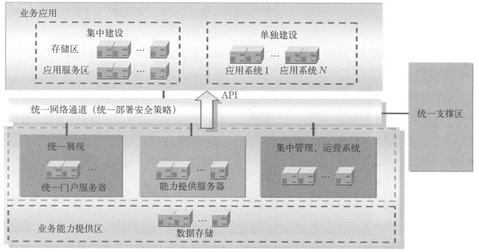 。5)應用業(yè)務區(qū):統(tǒng)一搭建應用硬件平臺,實現(xiàn)應用業(yè)務區(qū)業(yè)務應用及業(yè)務能力提供區(qū)接入通道類型的新增,均可直接在其硬件平臺上加載應用軟件、提供服務,調(diào)用現(xiàn)有資源實現(xiàn)。個別因為系統(tǒng)本身需求需要單獨建設、部署的系統(tǒng)則保留其單獨建設的方式。
