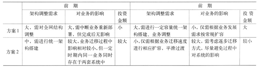 根據(jù)網(wǎng)絡演進架構清晰度、實施難度、投資金額等綜合因素考慮,對以上方案分析對比如表1所示。