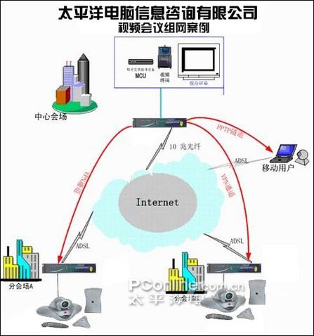 該方案有很強(qiáng)的針對(duì)性,作為主會(huì)場必須用10兆/20兆光纖接入INTERNET,且需要視頻交換處理設(shè)備MCU,而太平洋電腦網(wǎng)本身就具備雄厚的服務(wù)器作為基礎(chǔ)。廣州總公司還需要較高配置的視頻終端設(shè)備,在局域網(wǎng)網(wǎng)關(guān)上安裝較高配置路由器,主會(huì)場可以通過設(shè)置MCU隨時(shí)使某一分會(huì)場成為主席。