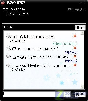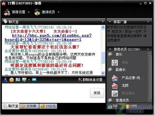 在群聊的過程中兩款軟件都各特色。百度Hi的特色是當(dāng)用戶向群中一個不是自己好友的人發(fā)送信息時,該用戶會在百度網(wǎng)頁短信息中可以收到消息,此項(xiàng)功能十分適合上班時不能打開聊天軟件的朋友使用。Lava則是將群功能體現(xiàn)的更加強(qiáng)大些,除了消息發(fā)送外可以建立屬于群部落的文件庫,就是這個部落的藏寶室,有什么好東東都可以放進(jìn)去,簡直就是超大的網(wǎng)絡(luò)硬盤。(圖9、圖10)