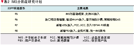 3GPP依照UMTS 3G移動(dòng)通信系統(tǒng)的系列標(biāo)準(zhǔn)版本定義了IMS的分階段演進(jìn)計(jì)劃[5],如表2所示。其中,2002年完成的R5是第一個(gè)全I(xiàn)P移動(dòng)網(wǎng)絡(luò)標(biāo)準(zhǔn),它將核心網(wǎng)歸為一個(gè)統(tǒng)一的基于IP的分組(PS)域,具有服務(wù)質(zhì)量(QoS)保證,能夠提供各種類型的多媒體增值業(yè)務(wù),其核心技術(shù)標(biāo)準(zhǔn)就是IMS。R6進(jìn)一步完善IMS接口和功能,增加對(duì)于WLAN的接入支持,并研究IMS域的計(jì)費(fèi)和QoS控制技術(shù)。R7融合TISPAN關(guān)于NGN的研究標(biāo)準(zhǔn),增加對(duì)于xDSL接入技術(shù)的支持,提出策略控制與計(jì)費(fèi)(PCC)技術(shù)以及WLAN/3G語(yǔ)音連續(xù)通信的話音連接連續(xù)(VCC)技術(shù)。正在研究中的R8將協(xié)同各個(gè)標(biāo)準(zhǔn)化組織的工作,研究支持組合業(yè)務(wù)的業(yè)務(wù)代理技術(shù)以及下一步的統(tǒng)一IMS架構(gòu)。