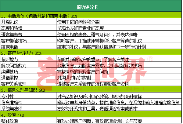 b.一個(gè)不可忽視的工作是對表中的各項(xiàng)進(jìn)行嚴(yán)格定義,然后訓(xùn)導(dǎo)師與主管、培訓(xùn)、質(zhì)檢師根據(jù)共同的錄音資料反復(fù)“核對筆記”,取得共識,并將樣本打分結(jié)果發(fā)給座席代表溫習(xí)。