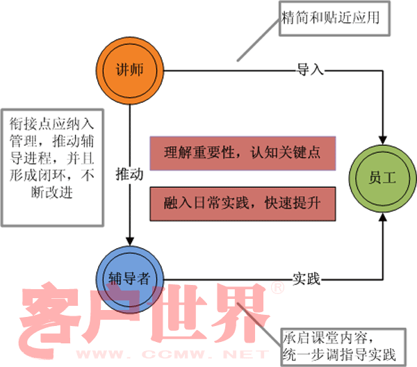 有了輔導(dǎo)者的角色,還需要有人去關(guān)注他們與講師之間的銜接。講師根據(jù)認(rèn)真的分析調(diào)查進(jìn)行判斷(或者由專門的隊(duì)伍進(jìn)行分析判斷),主導(dǎo)近期溝通技巧的側(cè)重點(diǎn),也就是確定前面說(shuō)的某個(gè)“地標(biāo)”。輔導(dǎo)者要按照講師的安排去組織管轄內(nèi)員工的實(shí)踐過(guò)程。遇到問(wèn)題,及時(shí)反饋,形成閉環(huán),不斷改進(jìn)。