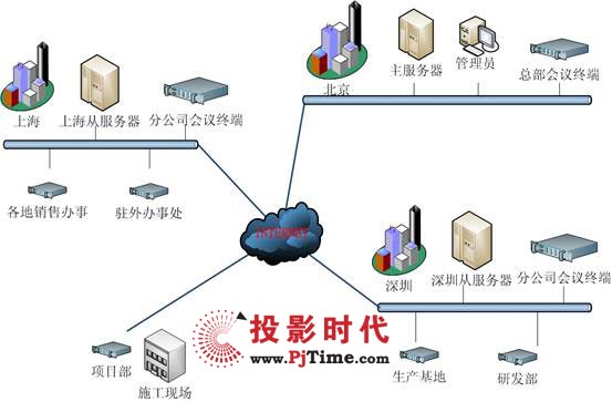 3臺高端專用服務(wù)器作為視頻會議服務(wù)器,可容納多點(diǎn)同時(shí)開會,以確保系統(tǒng)的穩(wěn)定性和性能要求。主服務(wù)器放置在總公司,從服務(wù)器共2個(gè),分別放置在輻射分公司面大,位于分公司中心的兩個(gè)城市。所有接入的服務(wù)器和客戶端采用同一網(wǎng)絡(luò)服務(wù)商的線路。配置了使用1000M服務(wù)器專用網(wǎng)卡,以保證正常的音視頻信號的傳輸。并且將服務(wù)器放置在主干/核心交換機(jī)上,使服務(wù)器和客戶端的路由/交換性能達(dá)到最佳效果。其網(wǎng)絡(luò)拓?fù)鋱D如下:
