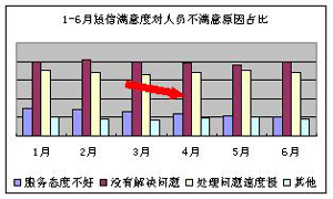 客服代表的工作情緒及客戶滿意度呈現(xiàn)上升趨勢:3-6月的短信滿意度穩(wěn)步提升(見下圖1),6月短信滿意度較3月提升1.25個百分點(diǎn),短信滿意度調(diào)查中“非常滿意”項占比自4月份開上升1.42個百分點(diǎn)(見下圖2)。從客戶不滿意原因情況看,由于人員導(dǎo)致客戶不滿意的比例下降0.6%(見下圖3);對導(dǎo)致人員不滿意的原因分析可知,話務(wù)員服務(wù)態(tài)度不好的占比有明顯的下降(見下圖4)。