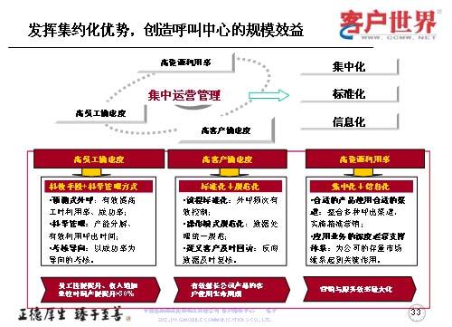 作為集中管理來講,突出“三高”,運用好“三高”體現(xiàn)的是如何進行集中化、標準化和信息化。我們從高員工滿意度,高客戶滿意度和高資源利用率入手,高員工滿意度主要是應用平臺和科學的管理方法,使得員工的技能持續(xù)提升,員工的自身收入也按單位時間而增長;高客戶滿意度是用標準化和規(guī)范化來進一步優(yōu)化流程,改進操作,對于目標客戶及時回訪,有效地延長公司產(chǎn)品的客戶使用生命周期,以創(chuàng)造公司的最大利益;作為集中化的呼叫中心,系統(tǒng)已經(jīng)投入了較大的座席規(guī)模,高資源利用率是如何把這些座席和系統(tǒng)的規(guī)模應用得更好,使得我們的產(chǎn)品能夠進一步地推向市場,被客戶所接受,所以我們采取了更多的整合呼出渠道,精確營銷,尤其對公司的存量客戶進行持續(xù)維系的關鍵時刻,達到營銷與服務效率的最大化。