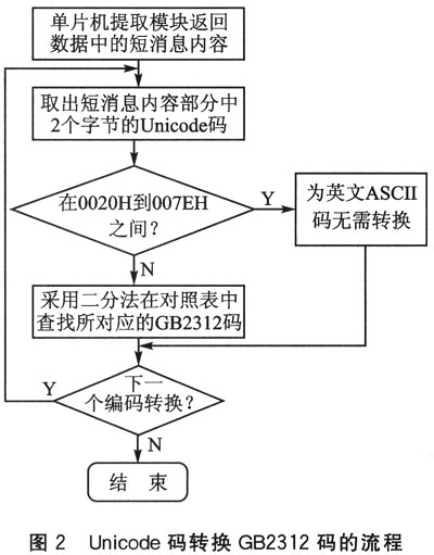 單片機(jī)通過串口與模塊連接后,發(fā)送讀取第一條新短消息指令:“AT+CMGR=1”。提取模塊接收的短消息后,先判斷其內(nèi)容是否為ASCII碼。若為ASCII碼,則無需轉(zhuǎn)換直接讀取;否則,通過查表法查找其對應(yīng)的漢字GB碼,實現(xiàn)不同編碼間的轉(zhuǎn)換。轉(zhuǎn)換流程如圖2所示。