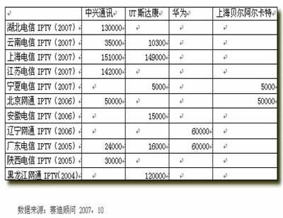 在IPTV設(shè)備供應(yīng)商中,各家廠商各有千秋,其中在國內(nèi)市場占有率最好的是中興通訊,其次是UT斯達(dá)康、華為、上海貝爾阿爾卡特。中興通訊跟華為均能提供端到端的解決方案,從頭端到客戶端,從業(yè)務(wù)層到傳輸層,提供完整的設(shè)備,可以使用統(tǒng)一的平臺對整個系統(tǒng)進(jìn)行管理,并且在保證統(tǒng)一的同還提供了較好的開放性,支持多家內(nèi)容提供商及STB的接入。