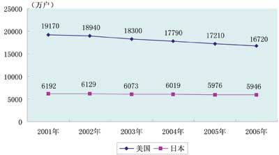 關(guān)于固定電話受沖擊的現(xiàn)象,美國(guó)比日本更加突出,這是因?yàn)槊绹?guó)大的通信公司除了提供電話、電視和高速上網(wǎng)捆綁服務(wù)外,基本上不提供IP電話(普通電話機(jī)經(jīng)本地市話交換機(jī)以及網(wǎng)關(guān)進(jìn)入因特網(wǎng))和VoIP電話(普通電話機(jī)經(jīng)電話連接器進(jìn)入因特網(wǎng))。美國(guó)衛(wèi)生統(tǒng)計(jì)中心公布的數(shù)據(jù)顯示,2007年下半年,美國(guó)只有移動(dòng)電話而沒(méi)有固定電話的家庭比例達(dá)到15.8%,這一比例在2004年同期只有6.1%,大約2%的美國(guó)家庭沒(méi)有電話。