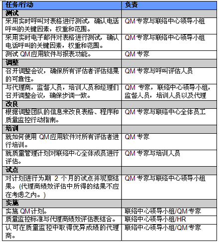 4. 開展項目交流。管理人員必須就新的或者修繕后的QM計劃與代理商進行交流。QM的成功與否與代理商的合作密不可分,如果代理商受邀參與新QM計劃的開發(fā)并且所有改變都在雙方之間明確交流過,那么成功的機會也將大大提高。交流的內(nèi)容應包括為什么要開發(fā)這樣一個計劃,它的作用和職責是什么,它對代理商會產(chǎn)生哪些影響(對于他們的評估和提升)以及它能帶來哪些好處。幫助代理商認識到QM計劃積極的一面很重要,因為只有這樣才能讓他們看到QM不僅僅是管理人員用來告訴他們做錯了事情的一種手段。讓聯(lián)絡中心全體員工參與QM計劃的開發(fā)能夠建立他們對該計劃的支持,提高接受度的同時避免不知所措。這對聯(lián)絡中心剛剛嶄露頭角,QM計劃還未全面鋪開的中國市場而言尤為重要。