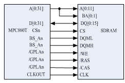 SDRAM的CLK信號(hào)由MPC860T的輸出時(shí)鐘CLKOUT驅(qū)動(dòng),/WE、/RAS和/CAS信號(hào)分別由UPMA的GPLA1~GPLA3產(chǎn)生。SDRAM的A10引腳要復(fù)用于SDRAM的刷新控制,因而必須與GPLAO相連(由于不方便連線(xiàn)圖中未畫(huà)出),因?yàn)镸PC860T的GPLAO可以通過(guò)編程實(shí)現(xiàn)控制信號(hào)與地址信號(hào)的復(fù)用。MT48LC4M16A2內(nèi)部有12條行地址和8條列地址,行地址為高位地址,列地址為低位地址,而外部?jī)H有12條地址信號(hào)A0~A11。這就需要對(duì)UPM對(duì)地址進(jìn)行復(fù)用。MPC860T支持內(nèi)部地址復(fù)用,可以通過(guò)UPM的RAM字中的AMX位進(jìn)行配置,同時(shí)將OR寄存器中的SAM位同時(shí)進(jìn)行配置。相關(guān)寄存器配置為:BR2=Ox0000081,說(shuō)明:32位寬,無(wú)奇偶校驗(yàn),無(wú)寫(xiě)保護(hù),選擇UPMA,基地址00000000;OR2=OxFF000A00,說(shuō)明:16Mbyte容量,地址復(fù)用。