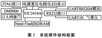 監(jiān)控系統(tǒng)控制器的核心CPU選用基于ARM920T內(nèi)核的16/32位RISC處理器 S3C2410A。該處理器功能強、性價比高、功耗低,提供了一套較完整的通用外圍設備接口,帶MMU(內(nèi)存管理單元),可支持Linux、μC/OS- II、WindowsCE等多種操作系統(tǒng)的移植。系統(tǒng)硬件結(jié)構(gòu)框圖如圖2所示。