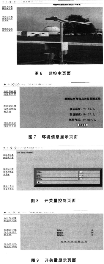 該監(jiān)控主頁面左側(cè)顯示有3個模塊:重新登陸頁面;觀測站遠程環(huán)境信息檢測系統(tǒng),能方便實時地查詢現(xiàn)場的環(huán)境狀態(tài),如圖7所示;現(xiàn)場開關的遠程監(jiān)控系統(tǒng),可以控制3個開關量的開關,如圖8所示,并能查詢它們當前狀態(tài),設置監(jiān)控頁面每隔15