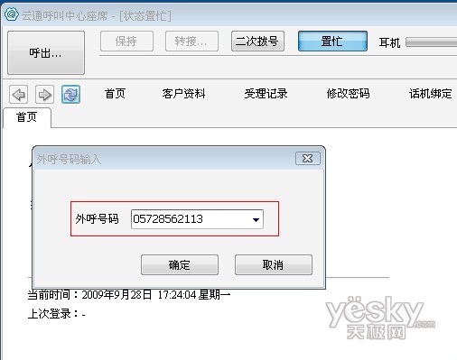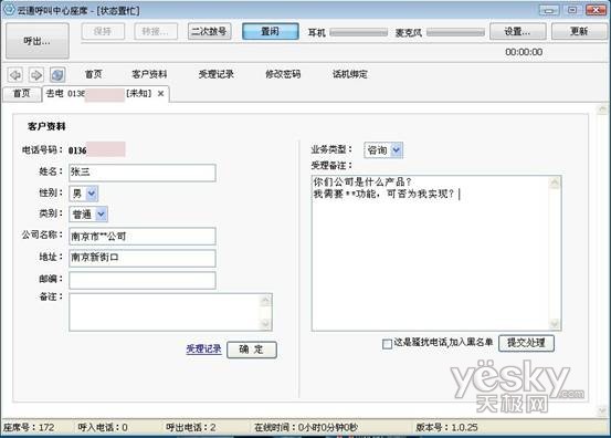 除此之外,當(dāng)使用座席軟件呼出時,若該號碼之前撥打過并留下過相關(guān)客戶信息,彈屏內(nèi)容會顯示其詳細(xì)的個人信息,并提供歷史受理記錄的查詢接口,起到輔助營銷人員的受理工作的作用,試問,如果再次撥打電話時就能詳細(xì)說出用戶的姓名以及當(dāng)時所提的需要,他是否會覺得很親切?(如下圖)如果該號碼未有客戶資料的記錄時,彈屏?xí)苯訛榭头峁┛蛻粼斍樘顚戫撁妫阌跔I銷人員很方便的就可以建立該客戶的個人檔案,提高受理效率。