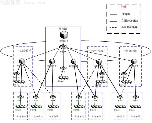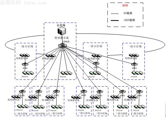 方案二:全集中式。在總前端集中部署若干臺視頻服務器,通過萬兆網絡直接向各分前端提供視頻流服務;示意圖如下: