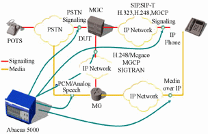 例如,運(yùn)營(yíng)商在部署VoIP網(wǎng)絡(luò)時(shí),有可能會(huì)采用A廠家的軟交換和B廠家的接入網(wǎng)關(guān)設(shè)備,如何確認(rèn)這兩家的設(shè)備在一起互通時(shí)沒有性能上的問題?這時(shí)可以采用儀表仿真接入網(wǎng)關(guān)下面的模擬線終端,往網(wǎng)關(guān)和軟交換側(cè)發(fā)起呼叫,再由軟交換將呼叫路由回網(wǎng)關(guān)再到終端。通過這種方式,由儀表發(fā)起成千上萬的呼叫經(jīng)過接入網(wǎng)關(guān)和軟交換,可以有效地驗(yàn)證這兩種設(shè)備在互通的時(shí)候有沒有性能和穩(wěn)定性問題。