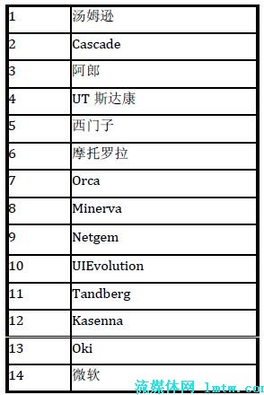 在中國市場上,UT 斯達(dá)康和中興公司暫時領(lǐng)先于其他公司。其中,UT 斯達(dá)康在海外也有不俗的表現(xiàn),如在印度和日本市場等;華為公司可以借助其整體解決方案的實(shí)力,有機(jī)會在下一代基于IMS 的IPTV 解決方案中脫穎而出。MRG 曾經(jīng)在2007 年3 月公布過一個市場調(diào)查,對IPTV 中間件及其市場影響力進(jìn)行了一個排名,具體的結(jié)果見表1。