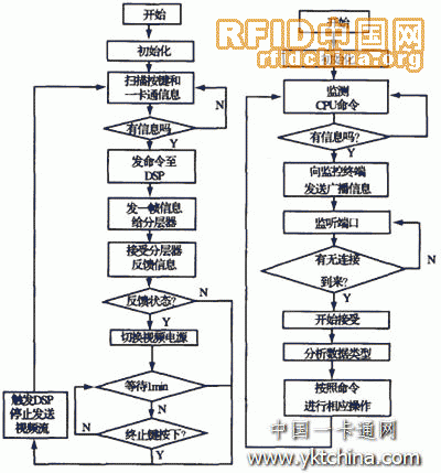 對(duì)于底層軟件,主要是門(mén)口終端的控制軟件,其工作流程如圖5所示。門(mén)口終端上電后,先進(jìn)行初始化工作,然后開(kāi)始掃描按鍵和一卡通信息,當(dāng)確認(rèn)有變化時(shí),微處理器CPU l先給分層器發(fā)送一幀信息,并且監(jiān)聽(tīng)分層器的反饋信息,同時(shí)啟動(dòng)DSP通過(guò)網(wǎng)絡(luò)端口發(fā)送廣播消息給監(jiān)控終端,以便啟動(dòng)監(jiān)控終端的接受線(xiàn)程接受視頻流和訪(fǎng)問(wèn)信息或一卡通信息。當(dāng)時(shí)間超過(guò)l min或終止鍵按下時(shí),雙方終止通信,門(mén)口終端與監(jiān)控終端之間由CPU1觸發(fā)DSP中斷,使其停止發(fā)送視頻流數(shù)據(jù)。