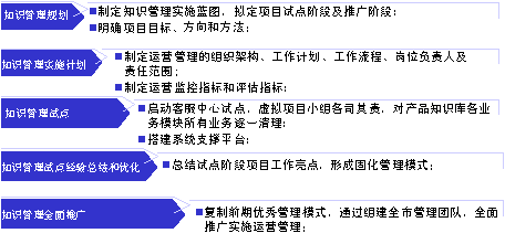 萬丈高樓平地起,本項(xiàng)目由客服中心總經(jīng)理牽頭,副總經(jīng)理和部門經(jīng)理組成領(lǐng)導(dǎo)小組,全面審視中心運(yùn)營管理現(xiàn)狀,探索“SECI知識(shí)循環(huán)管理”理論與實(shí)際工作結(jié)合點(diǎn),針對(duì)客服中心滿意度提升的三大主要癥結(jié)勾勒出知識(shí)管理實(shí)施藍(lán)圖,試點(diǎn)階段和推廣階段,總體目標(biāo)和階段性目標(biāo),監(jiān)控手段和評(píng)估指標(biāo)等。