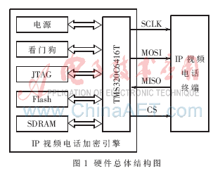加密引擎以TMS320C6416T為核心,包括SDRAM、Flash、電源、JTAG接口、看門狗等。加密引擎和IP視頻電話終端通過SPI總線通信,硬件總體結構如圖1所示。