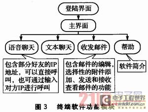 用戶打開終端軟件,可以根據(jù)自己的需要選擇語音聊天、文本聊天或者收發(fā)郵件。進(jìn)行語音聊天前,用戶可以直接在好友欄中選擇聊天對(duì)象,也可直接輸入對(duì)方的IP進(jìn)行連接。語音聊天的過程是:說話方,麥克風(fēng)采集模擬語音信號(hào)→語音芯片采集量化編碼→嵌入式系統(tǒng)對(duì)信號(hào)進(jìn)行壓縮編碼→RTP格式打包→UDP格式打包→IP格式打包→Internet網(wǎng)絡(luò)傳輸;收聽方,接收語音數(shù)據(jù)→去IP/UDP/RTP包頭→嵌入式系統(tǒng)對(duì)信號(hào)解碼→語音芯片將數(shù)字語音信號(hào)轉(zhuǎn)為模擬信號(hào)→揚(yáng)聲器播放。