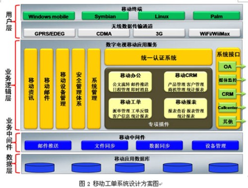 移動(dòng)工單系統(tǒng)是在Windows Mobile智能手機(jī)操作系統(tǒng)上自主研發(fā),采用B/S和C/S混合架構(gòu),以TCP/IP作為基礎(chǔ)數(shù)據(jù)傳輸協(xié)議,通過(guò)移動(dòng)通信網(wǎng)絡(luò)無(wú)線數(shù)據(jù)通道GPRS/EDGE/CDMA1x等,將呼叫中心的工單數(shù)據(jù)推送到智能手機(jī)上,由外勤服務(wù)人員將服務(wù)情況進(jìn)行實(shí)時(shí)的反饋。利用的同步中間件可將最新的資訊文件推送到手機(jī)終端上,服務(wù)人員無(wú)需登錄即可在終端可以查看最新的廣電資訊,可支持doc、xls、ppt等 Office文檔格式的瀏覽,支持WMV、WAV、3GP多種音視頻文件播放。服務(wù)人員可以不受地點(diǎn)和時(shí)間的限制通過(guò)終端實(shí)時(shí)獲取最新的多媒體客戶(hù)交互中心運(yùn)營(yíng)數(shù)據(jù)報(bào)表,圖2為系統(tǒng)設(shè)計(jì)方案圖。